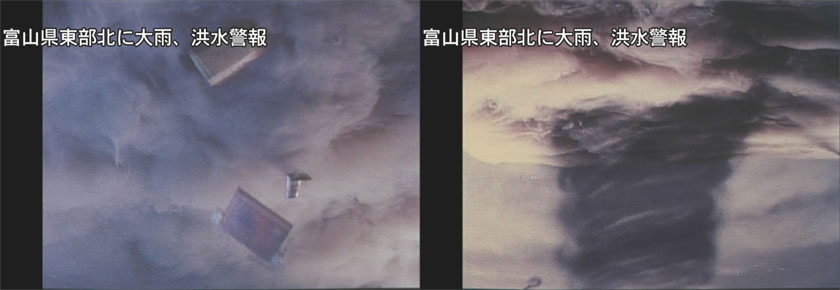 劇中で台風情報が出るのとまったく同じタイミングで、現実の注意報テロップが。