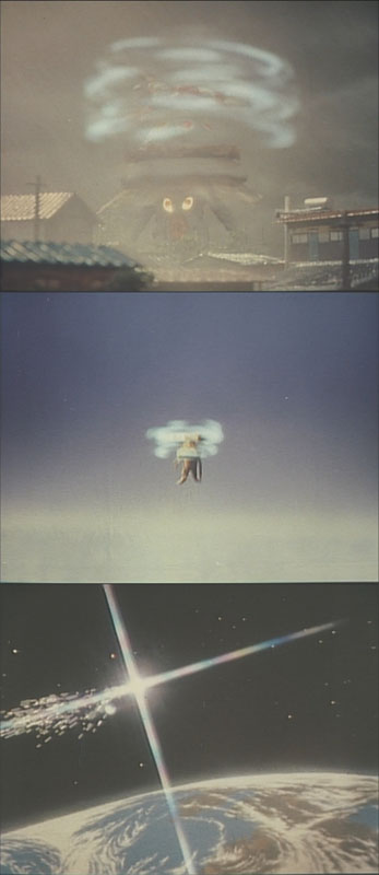 台風には台風じゃ、とばかりにウルトラマンは謎の回転技で怪獣を宇宙で屠ります。